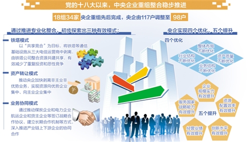 5年来,央企重组着力推进强强联合,稳妥推进装备制造、电力、钢铁、航运、建材、旅游等领域企业重组,更好发挥协同效应,实现优化提升。尤其是专业化整合成效显著,初步探索出铁塔模式、资产转让模式、业务协同模式等3种有效模式��