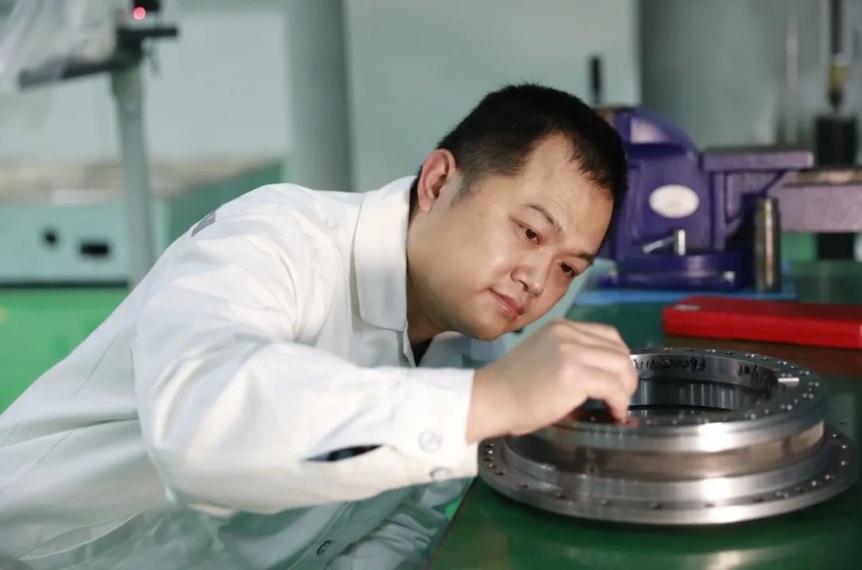 “必须持之以恒地以精益求精、精雕细琢的工匠精神打造所经手的每个产品!”这是周虎常提的一句话。燃气轮机机匣零组件制造精度要求高,装配质量控制严,其加工、装配工艺技术代表机械制造行业的先进水平。武汉船机首套燃气轮机机匣产品装配工作由周虎带领班组成员进行,其高超的技能水平保障了产品的装配质量与进度。在25兆瓦燃气轮机过渡段机匣叶片装配过程中,因叶片与机匣外环装配为燕尾槽式的榫接结构,叶片榫头与燕尾榫槽三面的接触面积要求高达80%以上,需由钳工拂配以达该指标。叶片榫头拂配过程中,周虎采用锉刀锉削装配面,利用其长期磨练掌握的良好手感,将锉削量误差控制在0.005-0.01毫米,大大减少了叶片试装配次数,装配效率显著提升。