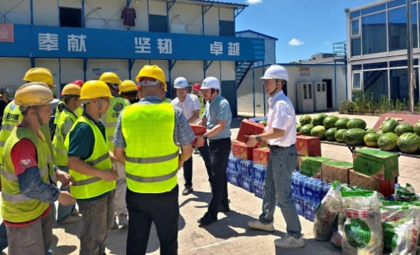中船国际工程在项目现场开展综合检查工作,并向坚守岗位的项目员工及劳务队伍送上防暑降温物资,叮嘱大家要科学合理安排作业时间,切实做好防暑降温措施。