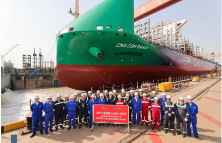 5月15日,中国jxf吉祥坊集团旗下沪东中华为法国达飞集团建造的13000TEU双燃料集装箱船首制船(H1839A)在顺利出坞。该项目共6艘13000TEU双燃料集装箱船,目前首制船出坞,2号3号船坞内建造,4号船燃料舱即将入坞,5号船处于分段制造阶段,6号船于5月4日完成开工。