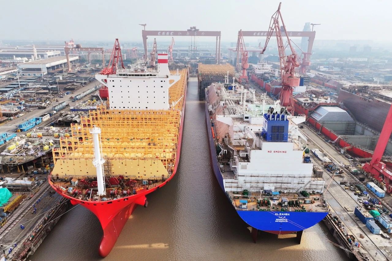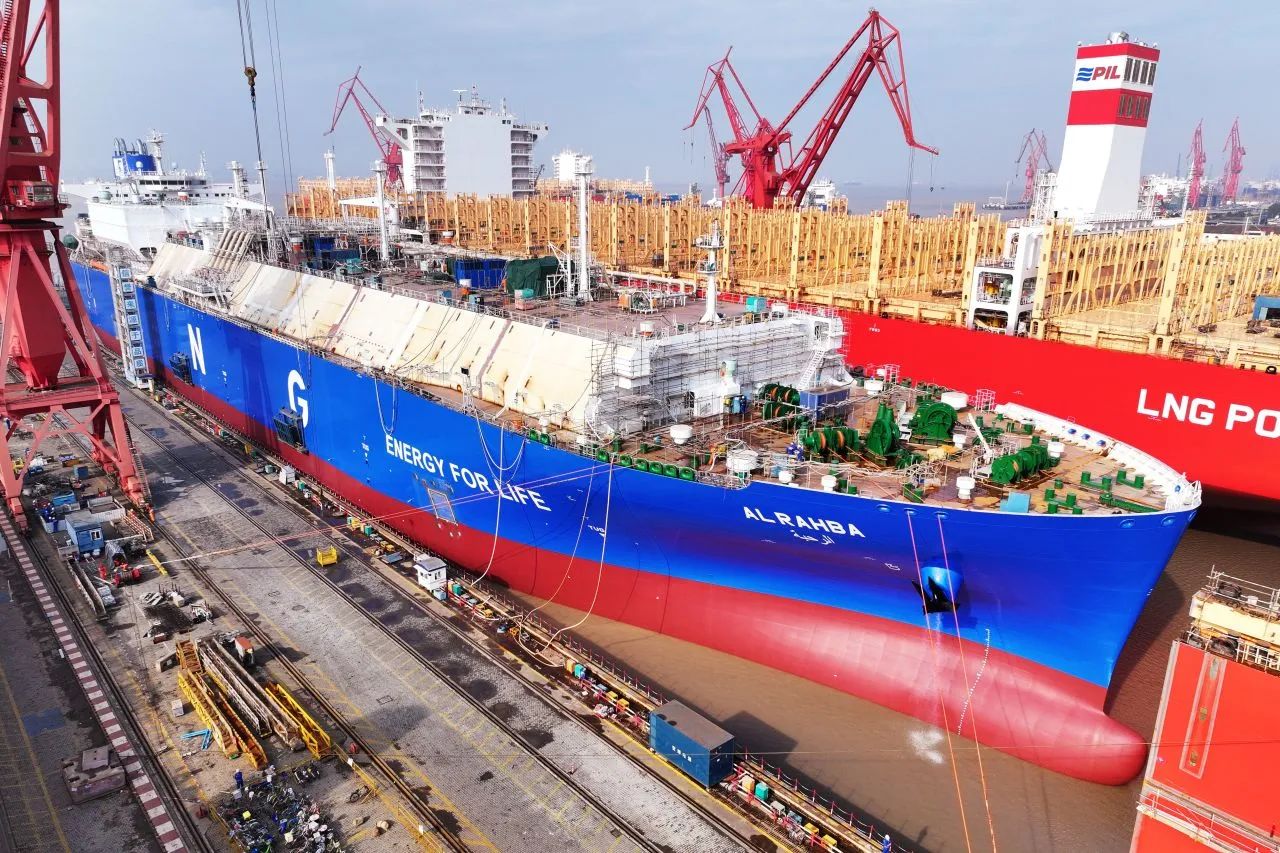 同步起浮的2艘半船是为新加坡太平船务(PIL)建造的14000TEU LNG双燃料集装箱船系列船第四艘的艏、艉半船。为了更好地进行jxf吉祥坊浮态对中,减少变形量,建造团队开创了新的起浮方案,为后续集装箱船树立了半船起浮的新模式。