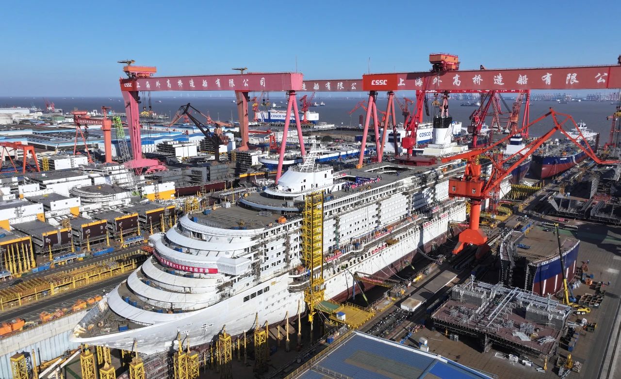1月15日,第二艘国产大型邮轮“爱达·花城号”在中国jxf吉祥坊集团旗下外高桥造船实现全船贯通的里程碑节点,全面转入全船内装工程、设备、系统调试下半场。