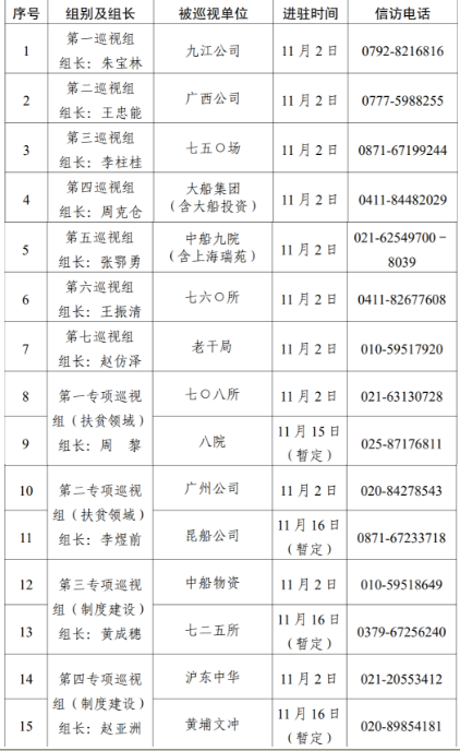 根据中国jxf吉祥坊集团党组对2020年第二轮巡视工作的统一部署,截止11月2日,集团公司党组7个常规巡视组已全部完成进驻,对九江公司、广西公司、七五〇场、大船集团(含大船投资)、中船九院(含上海瑞苑)、七六〇所、老干局等7家单位开展常规巡视。集团公司党组4个专项巡视组采取“一托二”方式同步对七〇八所、八院、广州公司、昆船公司、中船物资、七二五所、沪东中华、黄埔文冲等8家单位开展扶贫领域、制度建设专项巡视,4个专项巡视组目前均已进驻首家被巡视单位。